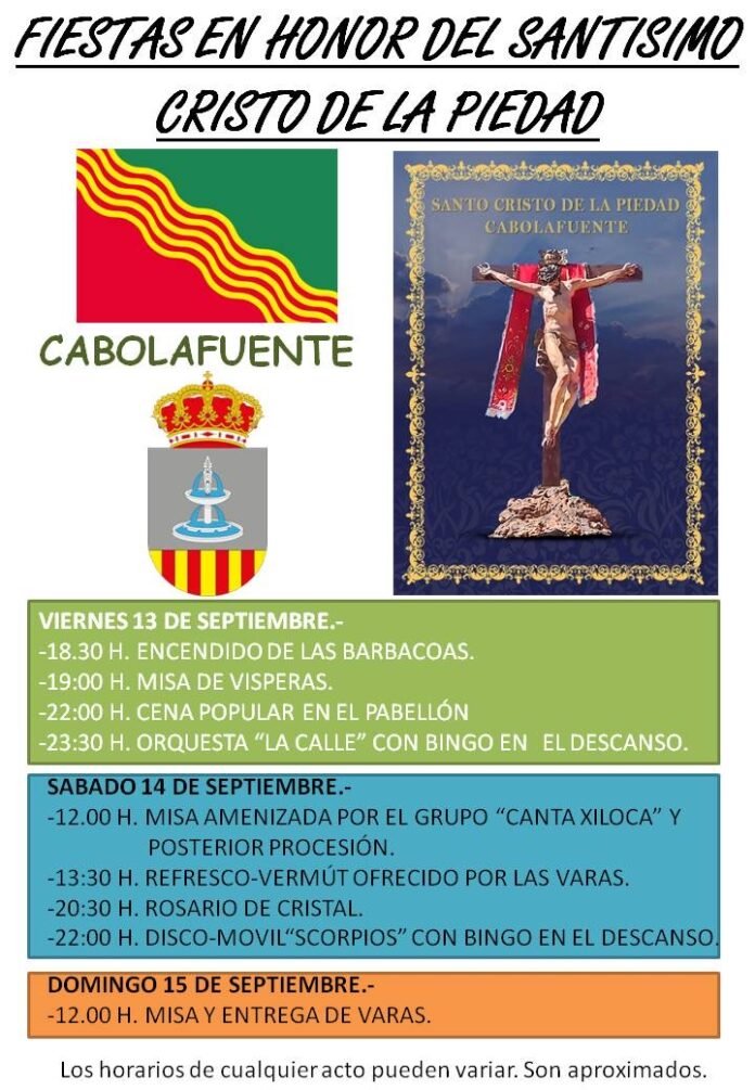 La localidad de Cabolafuente, en la Comarca Comunidad de Calatayud, ya cuenta las horas para arrancar sus fiestas en honor del Santísimo Cristo de la Piedad. Tres días en los que no faltarán los actos musicales y los religiosos, entre otros, y que comenzarán este próximo viernes 13 de septiembre.