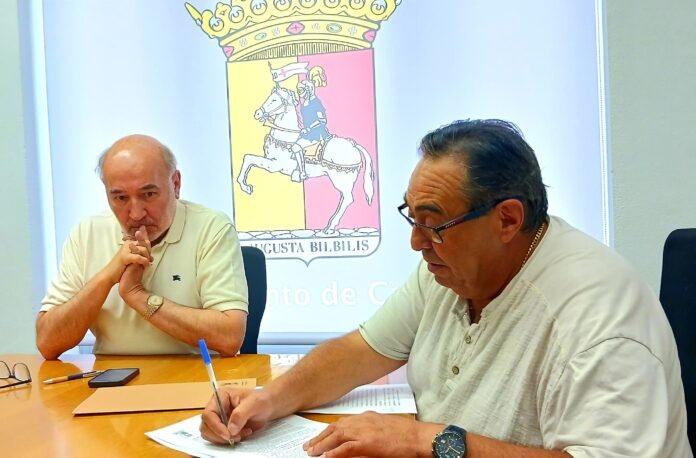 El presidente de la Federación de Interpeñas, Gerardo Bernal, y el alcalde de Calatayud, José Manuel Aranda refrendaban esta misma mañana el convenio de colaboración económica entre esta entidad, que agrupa a las diez peñas de San Roque y el Ayuntamiento de Calatayud.