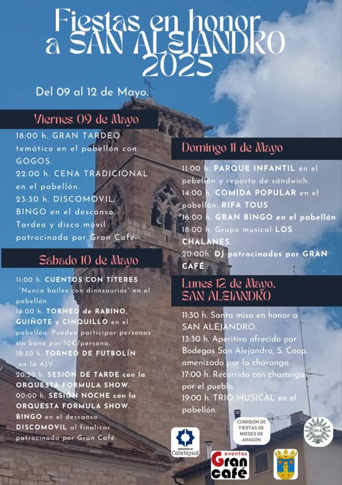 Desde este próximo viernes 9 y hasta el lunes 12 de mayo, la localidad de Miedes de Aragón, en la Comarca Comunidad de Calatayud, acogerá una completa programación de actividades para todas las edades, desde espectáculos infantiles hasta verbenas y actos religiosos en honor a San Alejandro.