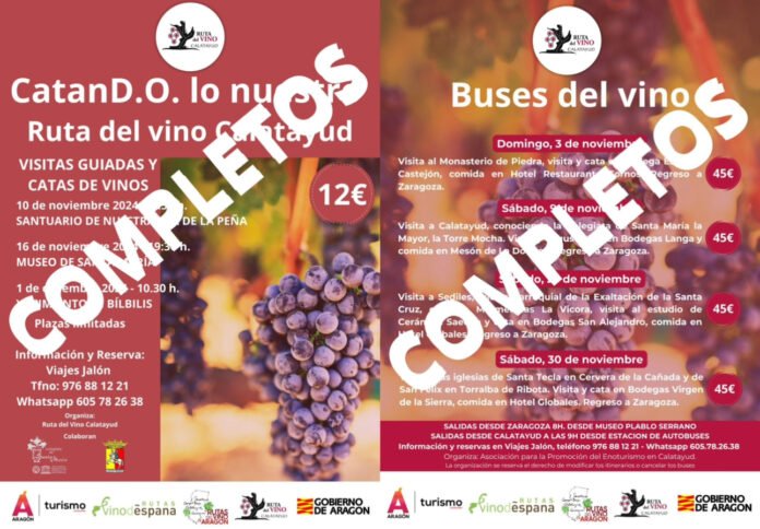 La Ruta del Vino de Calatayud ha emitido un comunicado anunciando que todas las plazas para el ciclo “CatanD.O” y los buses del vino, se han completado. “Queremos agradecer a todos los que se han sumado a las actividades de este Mes del Enoturismo, mostrando con su entusiasmo que el enoturismo está en pleno auge”.