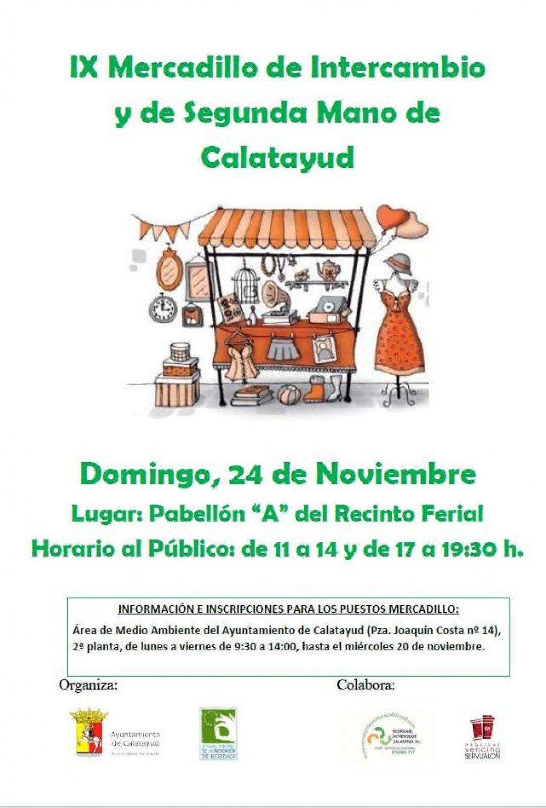 El Departamento de Medio Ambiente del Ayuntamiento de Calatayud ha abierto el plazo para que quienes quieran tener su puesto en el Mercadillo de Intercambio y Segunda Mano, soliciten un espacio. Hasta el día 20 de noviembre y en horario de 9.30 a 14.00 horas se recogen las inscripciones en las oficinas municipales del Ayuntamiento de Calatayud de la plaza Joaquín Costa, en la segunda planta.