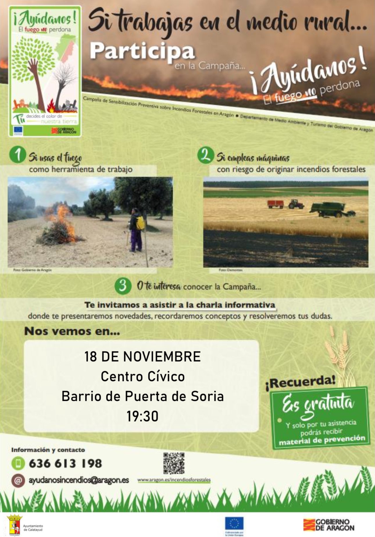 La cita es hoy, 18 de noviembre, a las 19:30 horas en el Centro Cívico del Barrio de la Puerta de Soria de Calatayud. La asistencia a esta reunión, organizada por el Departamento de Medio Ambiente y Turismo del Gobierno de Aragón, es completamente gratuita, y los participantes recibirán material de prevención como agradecimiento por su compromiso.