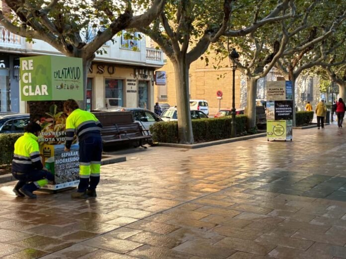 Los 6 tótems que se han instalado esta mañana tienen cada uno 2,10 metros de altura y los forman tres cubos ensamblados verticalmente y revestidos con paneles gráficos. En cada uno de ellos por medio de imágenes se expone la recogida separada de biorresiduos en Calatayud, el primer municipio de la provincia en el que se construyó una planta de compostaje para tratar esos residuos.