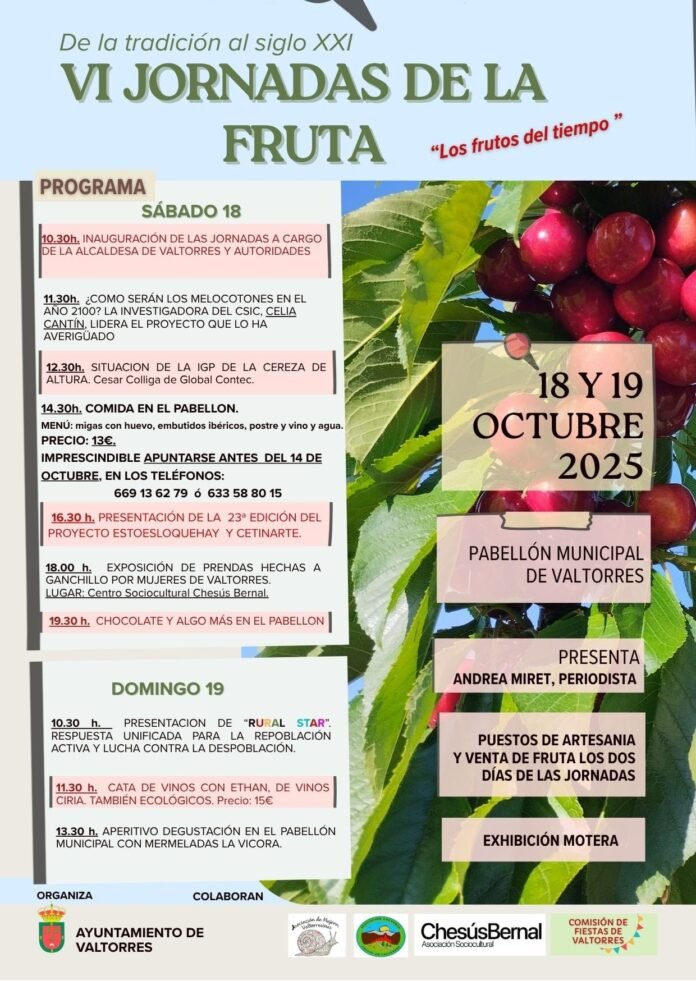 La localidad de Valtorres, en la Comarca Comunidad de Calatayud, se vestirá de gala el próximo fin de semana del 18 y 19 de octubre para celebrar la VI Jornadas de la Fruta, un evento que conjuga la tradición agrícola con la innovación del siglo XXI. Bajo el lema «Los frutos del tiempo», las jornadas prometen un intenso programa de actividades en el Pabellón Municipal de Valtorres.