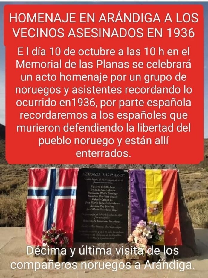 Un grupo de noruegos visitarán hoy la localidad de Arándiga, en la Comarca Comunidad de Calatayud, para recordar y homenajear a unos vecinos asesinados durante la Guerra Civil Española en este municipio. Sus cuerpos fueron recuperados de una fosa común en 2014 y desde entonces, este grupo se traslada a Arándiga para rendirles su homenaje.