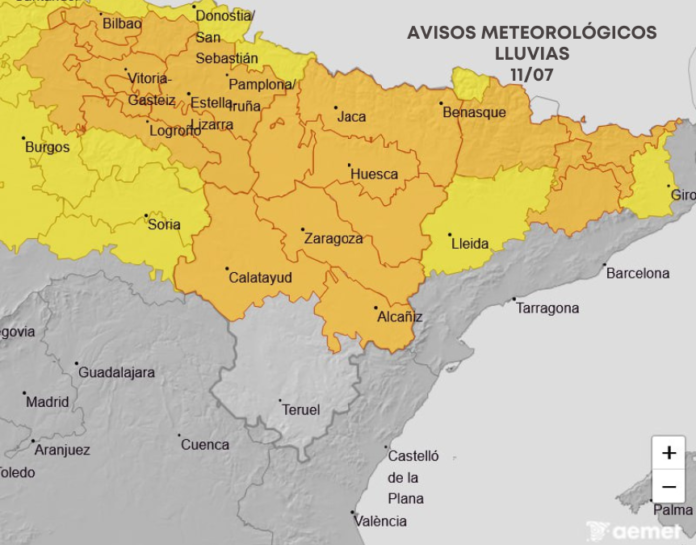 La Dirección General de Interior y Emergencias del Gobierno de Aragón informa de que la Agencia Estatal de Meteorología (AEMET) ha emitido un aviso para este viernes, 11 de julio. Es un aviso naranja por lluvias y tormentas en las comarcas de la Comunidad de Calatayud y el Aranda, entre las 16h y las 23:59h.