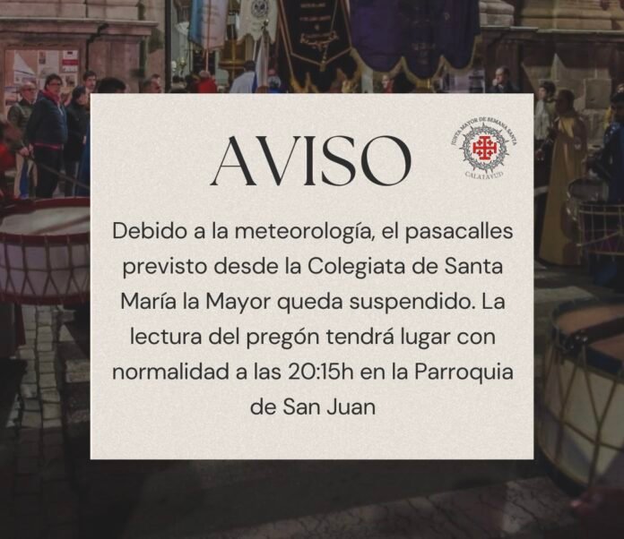 Debido a las condiciones meteorológicas, la Junta Mayor de Semana Santa y las diferentes cofradías y hermandades penitenciales de Calatayud han decidido suspender el pasacalles del Pregón de Cuaresma previsto para esta misma tarde.