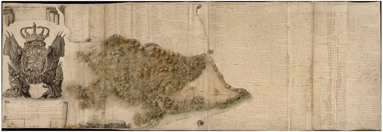 Detallo algunos aspectos de su contenido para auxilio de su lectura: el plano topográfico es una acuarela donde figuran los lugares que aportaban el cáñamo de las regiones citadas con ubicación relativa de los pueblos. En la leyenda superior se detallan los pueblos pertenecientes a la Comarca o Partido que contrataban cáñamo en el año de 1749, con indicación de las arrobas de su lote y una anotación en el margen izquierdo indicando si su calidad era Buena o Mala, lo que creemos que tendría su importancia para sucesivos contratos.