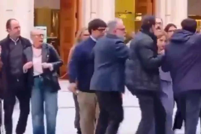 Las imágenes captadas durante el suceso muestran cómo Quiles se abrió paso a empujones entre los parlamentarios para increpar directamente a la analista. La situación escaló rápidamente hacia un escenario de desorden en la entrada del recinto, obligando a los presentes a intentar proteger a Santaolalla mientras los acompañantes de Quiles también intervenían en la disputa.