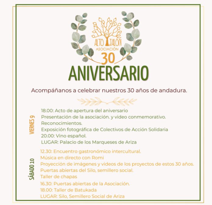 La Asociación Sociocultural Alto Jalón está de celebración. Cumple 30 años de andadura trabajando por el desarrollo rural y la mejora de la calidad de vida en los pueblos de la comarca. Para conmemorar estas tres décadas de esfuerzo y logros, la asociación ha organizado dos jornadas festivas los próximos 9 y 10 de mayo en la localidad de Ariza, en la Comarca Comunidad de Calatayud.