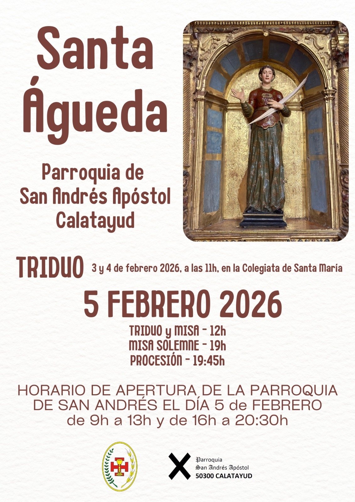 Calatayud celebra hoy Santa Águeda: triduo, misas y procesion desde la Parroquia de San Andrés Apóstol