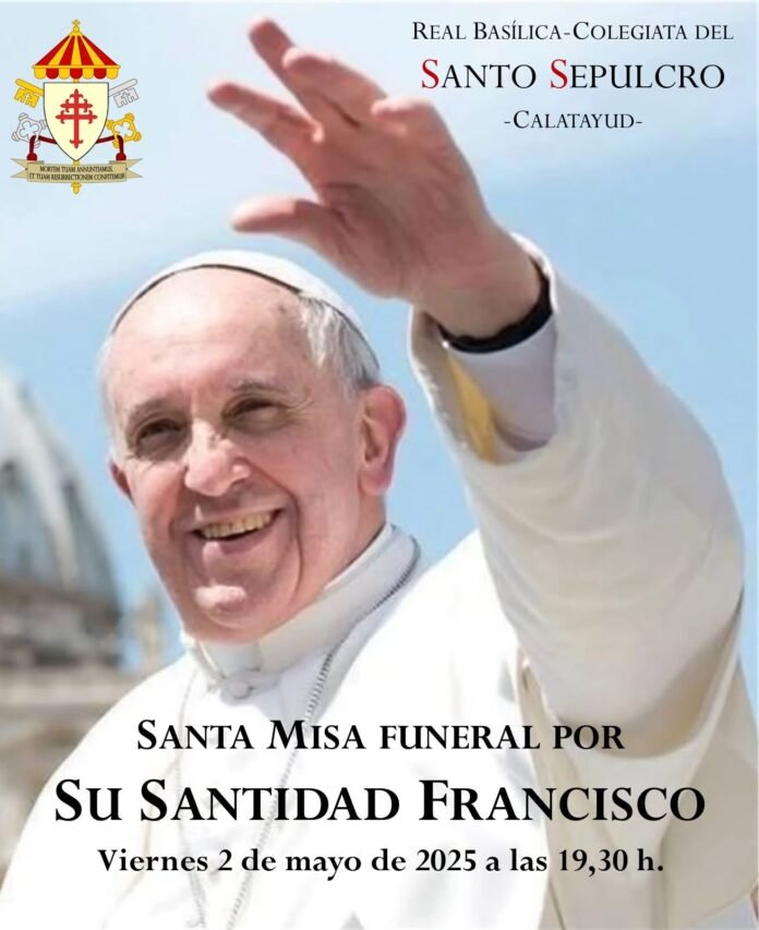 La Real Basílica Colegiata del Santo Sepulcro de Calatayud ha anunciado la celebración de una misa funeral por el eterno descanso de Su Santidad el Papa Francisco. El acto tendrá lugar este viernes 2 de mayo a las 19:30 horas.