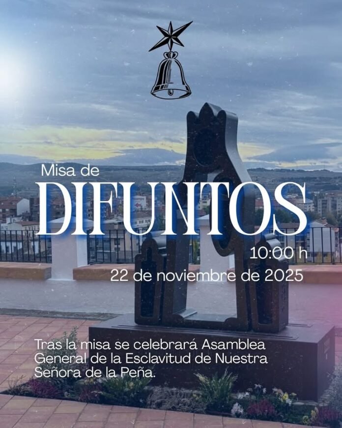 La Esclavitud de Nuestra Señora la Virgen de la Peña invita a todos los fieles a participar en la Misa de Difuntos, que se celebrará el próximo sábado 22 de noviembre, a las 10:00 h, en el Santuario de la Virgen de la Peña de Calatayud.