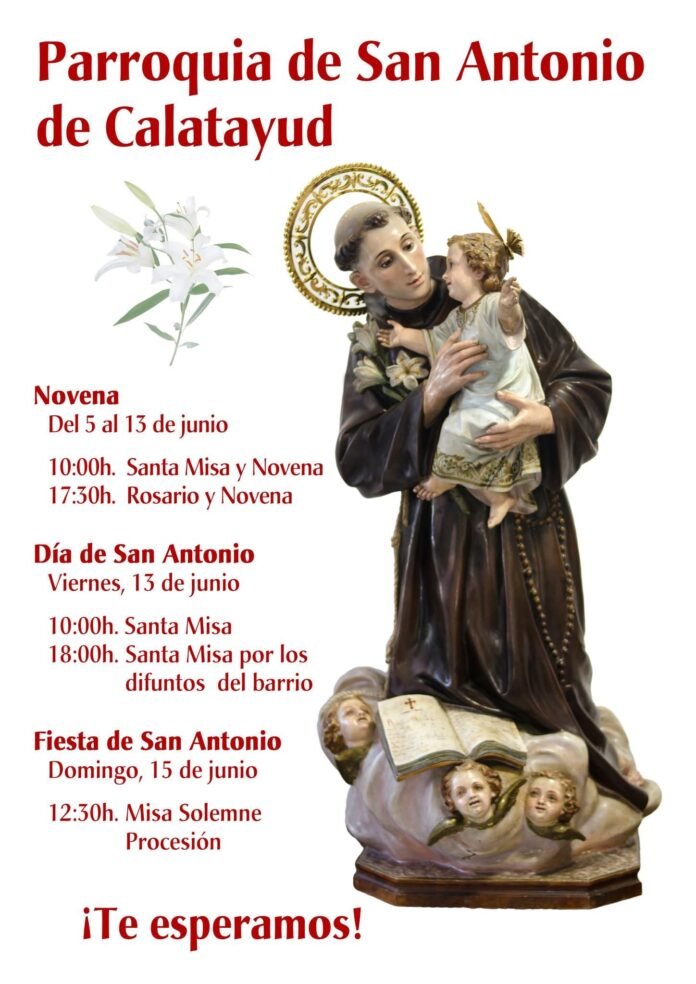 Calatayud se alista para las celebraciones en honor a San Antonio de Padua, patrón de la Parroquia de San Antonio de Calatayud. Los eventos incluyen una novena, misas especiales y una procesión, invitando a todos los vecinos del barrio y de Calatayud a participar.
