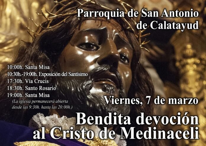El próximo viernes 7 de marzo, la Parroquia de San Antonio de Padua de Calatayud acoge la fiesta del Cristo de Medinaceli. Durante todo el día, de 9:30h a 20h, la parroquia bilbilitana permanecerá abierta y se realizarán diferentes celebraciones.