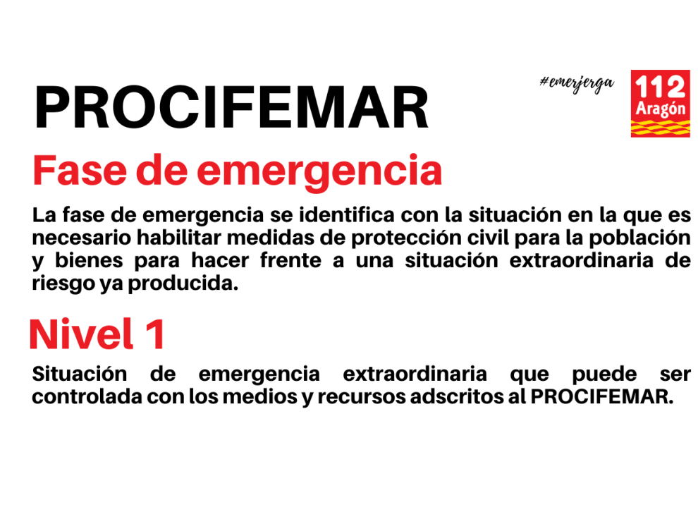 La emergencia es declarada de nivel 1 cuando la situación generada o la evolución previsible de la misma puede ser controlada con los medios y recursos asignados al PROCIFEMAR.