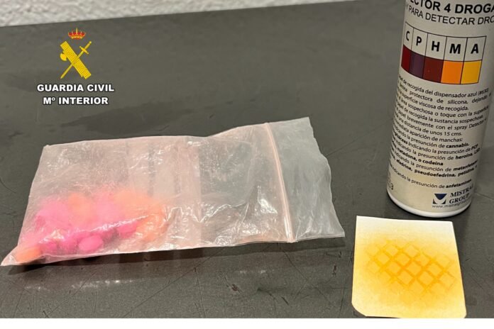 Durante la identificación estas personas se mostraron con evidente nerviosismo y, en la inspección de sus pertenencias, se halló en el bolsillo del pantalón del copiloto, una bolsa transparente que contenía 26 pastillas de una posible sustancia estupefaciente la cual, tras someterla al narcotest, dio resultado positivo en MDMA.