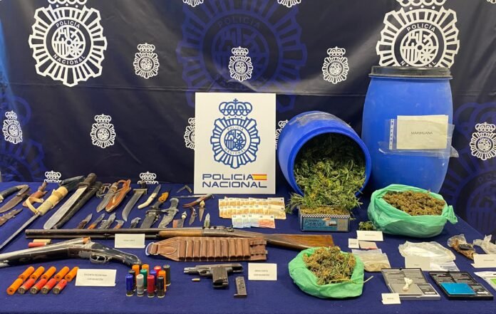 Durante el registro se intervinieron más de 80 kilogramos de marihuana, 230 gramos de otras sustancias estupefacientes (speed, éxtasis y hachís), dos armas de fuego, una de ellas una escopeta con cañones recortados y otra un pistola, ambas preparadas y municionadas para hacer fuego, casi una treintena de armas blancas y más de mil euros en efectivo.