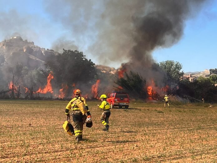 Alrededor de las 17h de hoy, los servicios de emergencias han intervenido en un nuevo incendio de vegetación de ribera a la orilla del Río Jalón, en Calatayud. Nuevamente ha ocurrido en la salida hacia la A-202, a la altura de la Residencia de las Hermanitas de los Ancianos Desamparados.