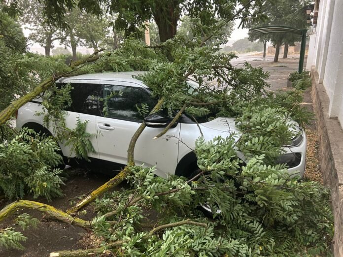 Numerosas afecciones durante la tarde de hoy en Calatayud debido a las fuertes rachas de viento: un árbol ha caído sobre un coche en la zona del Cementerio