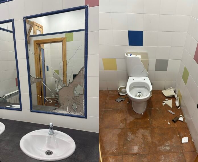 Los atacantes aprovecharon que el acceso al edificio se encontraba abierto para ensañarse con el mobiliario de los servicios. Entre los daños materiales más destacados se encuentra la rotura de espejos y diversos elementos de los baños. Se da la circunstancia de que, aunque recientemente se instaló una puerta automática para controlar el acceso al recinto, esta todavía no se encuentra en funcionamiento, lo que facilitó la entrada de los autores de los hechos.