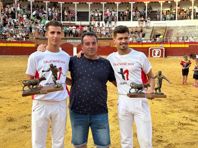 La pareja formada por Xabier Iturralde y Javier Soler fueron los primeros clasificados de la tarde. Un premio que recogían de la mano del Peñista del Año, Carlos Navarro “Chichetas” y cuyo trofeo regalaban a Chus Zaldívar, recortador herido y trasladado por los servicios sanitarios al Hospital durante el festejo. Iturralde y Soler encajaban dos anillas en la fase clasificatoria y tres en la final.