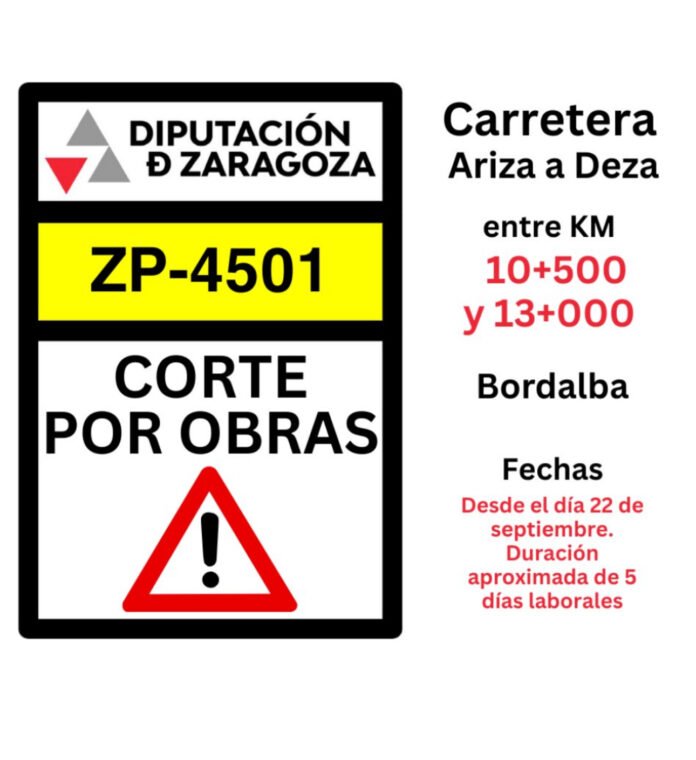 La carretera ZP-4501 de Ariza a Deza (antigua CV-682) permanecerá cortada al tráfico a partir de hoy lunes, 22 de septiembre. La Diputación Provincial de Zaragoza va a llevar a cabo obras de mejora en esta vía provincial dentro del programa de actuaciones en carreteras 2024-2031.