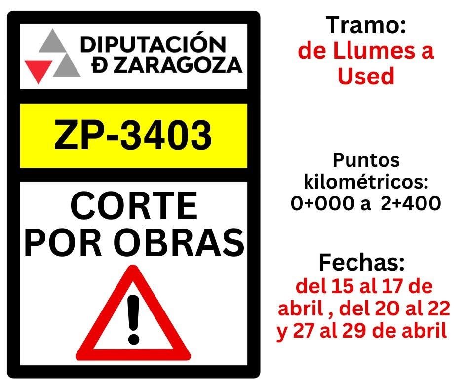 La Diputación Provincial de Zaragoza está llevando a cabo trabajos de mejora de la carretera ZP-3403 entre los puntos kilométricos 0,000 (A-202) y 6,500 (Cimballa), por lo que la vía permanecerá cortada al tráfico también del 20 al 22 y del 27 al 29 entre la Z-412 de acceso a Llumes (punto kilométrico 2,400) y Cimballa (punto kilométrico 6,500).