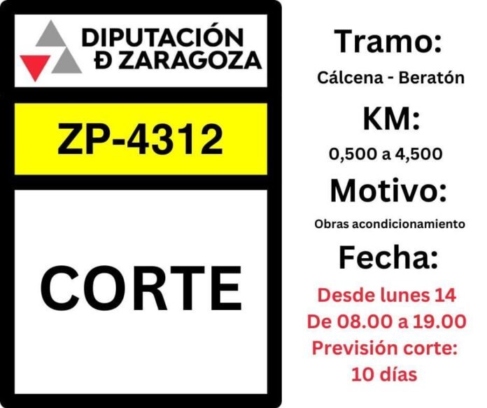 La carretera provincial que conecta Calcena y Beratón (la ZP-4312, la antigua CV-630), permanece cortada al tráfico por obras desde este lunes. La Diputación Provincial de Zaragoza va a llevar a cabo trabajos de acondicionamiento en esta vía provincial.
