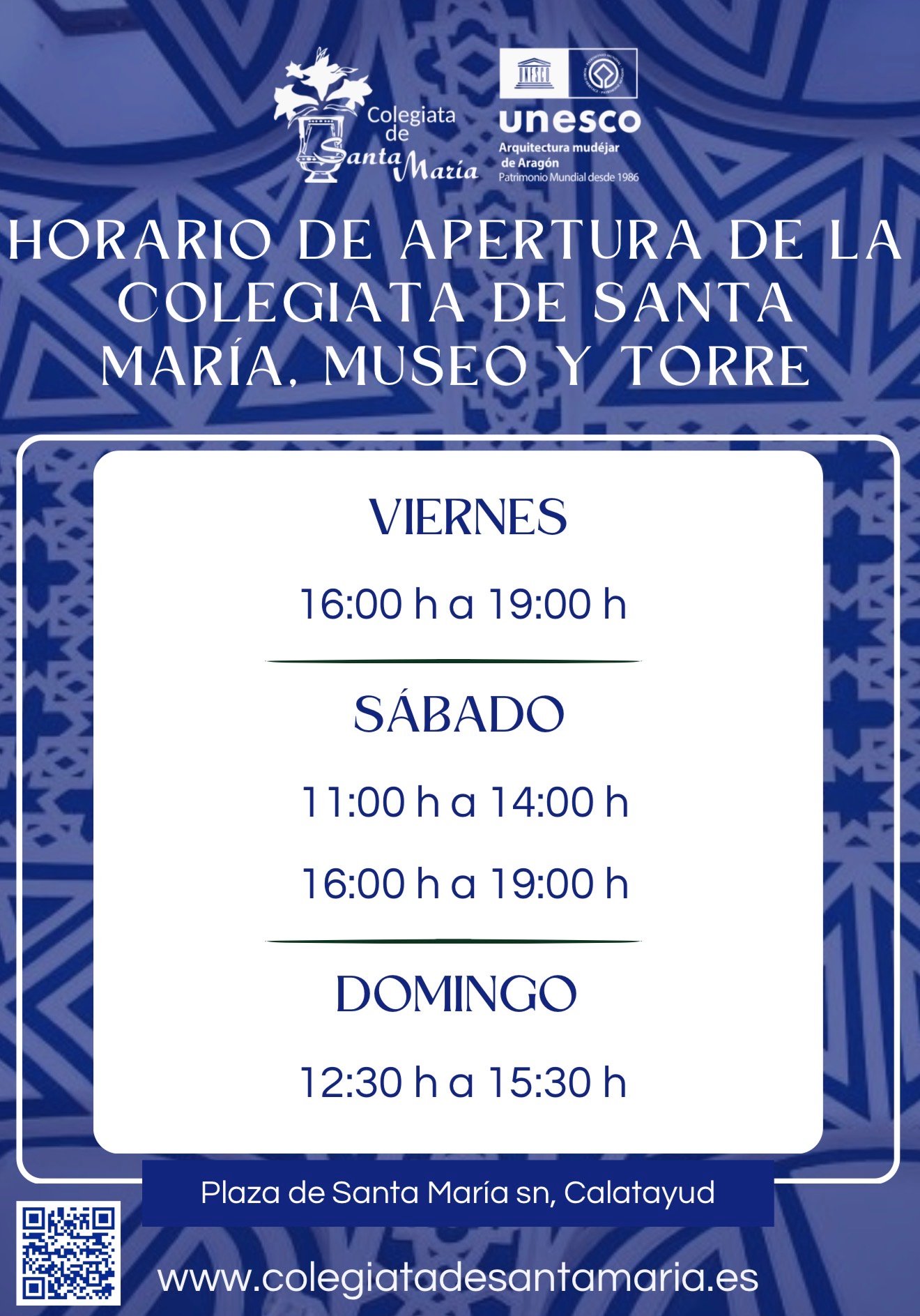 La colegiata bilbilitana ofrece a partir de ahora un horario de visitas concentrado en el fin de semana para facilitar el acceso a su museo y a su espectacular torre mudéjar. Los interesados podrán acercarse los viernes por la tarde, en horario de 16:00 a 19:00 horas, mientras que el sábado el monumento permanecerá abierto tanto en sesión de mañana, de 11:00 a 14:00 horas, como de tarde, repitiendo el horario de 16:00 a 19:00 horas. Para cerrar la jornada semanal, el domingo se ha establecido un horario continuo de mediodía, desde las 12:30 hasta las 15:30 horas.
